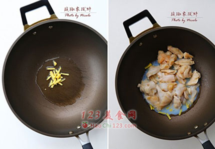 1、锅烧热,放少许油,烧热后放入姜丝爆香。