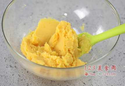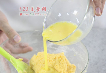 2、红薯泥里加入奶粉、盐,用刮刀拌匀。将鸡蛋打散加入红薯泥里,并继续拌匀。