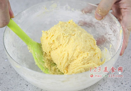 3、加入低筋面粉和糯米粉,用刮刀拌匀成为湿润的面团(因为红薯含水量的不同,加入的糯米粉用量可能不一样,请根据实际情况调整糯米粉用量,拌成一个柔软的面团)。