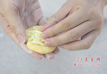 4、取一小块面团揉成圆形在手上压扁。如果面团不会太黏手,压扁后边缘也不会出现裂纹,就表示软硬程度合适。在压扁的面团上放一些马苏里拉芝士丝。
