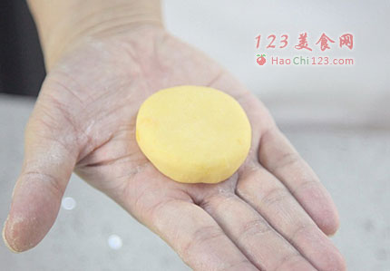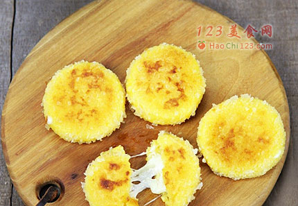 3、马苏里拉芝士,就是我们做比萨的常用芝士,加热熔化后具有拉丝效果,让这款红薯饼的味道更丰富。可以用马苏里拉芝士丝,也可以买块状的马苏里拉芝士,切成5-6克一个的小块,每个红薯饼里包入一小块芝士。[LaoYanHuo.com]