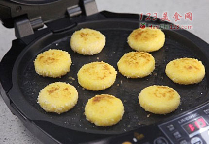 9、时间到以后,打开电饼铛,将小圆饼翻面,并继续烙一会儿(不用盖上电饼铛),观察小圆饼表面呈现金黄色,并且一个个都鼓起来的时候,就表示熟了。烙好的红薯饼趁热食用。