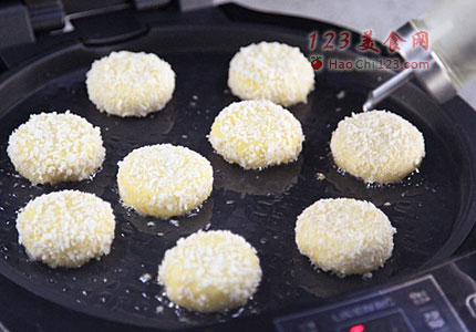 8、预热好的电饼铛下盘倒一些植物油,将小圆饼放入,盖上电饼铛,选择小火,自主烙烤3-4分钟。