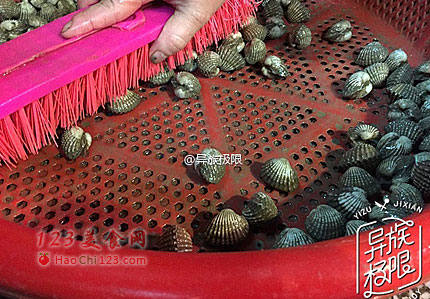 2、带有泥沙的血蚶放入大塑料筐里,用一把大刷子反反复复来回刷,并边流动的水冲洗掉泥沙,直到蚶壳发白。洗蚶一般在市场上摊主会代劳,省事多了。