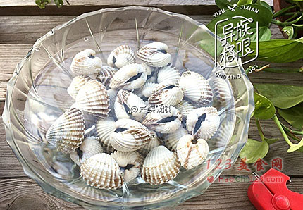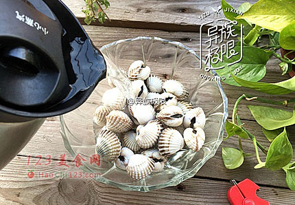 4、煮一壶80°左右的热水,冲到装血蚶的容器里。