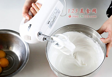 3、一个蛋白加盐和柠檬汁打发,加糖接着打到湿性发泡。