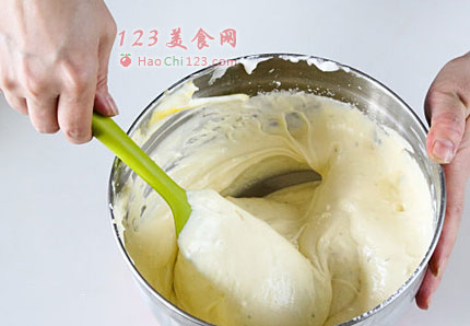 4、将蛋黄混合物倒入蛋白,搅拌均匀。然后把分类混合物过筛放到蛋糊,缓慢搅拌。