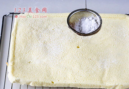 6、烤好后赶紧拿出来撒上糖粉,将烘焙纸取下然后用布卷起来冷却。