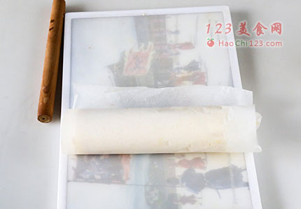 9、填入蛋糕片中,抹平。蛋糕借助擀面杖卷起。然后放入冰箱冷却2小时。