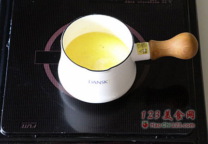 3、牛奶和黄油加入面粉中拌和,拌匀后再倒入锅中煮至黏稠,放凉即可。