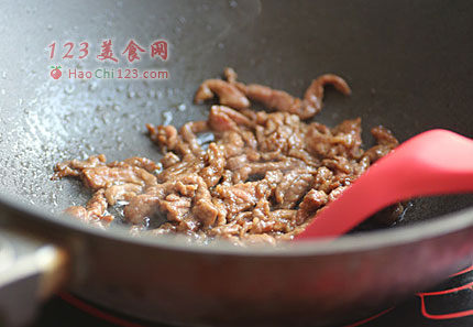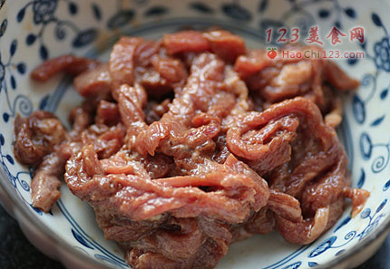 4、炒锅入黄油化开,下入肉丝滑熟后盛出备用。