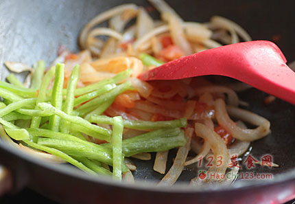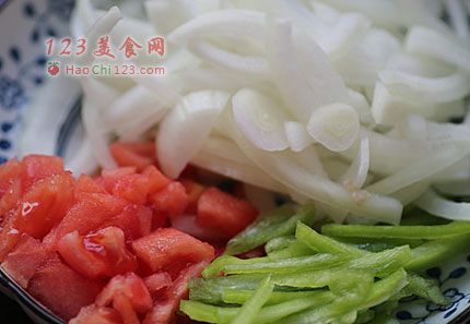 2、西红柿去皮切小丁,青椒、洋葱切丝备用。