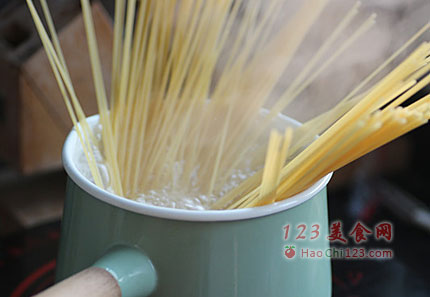 3、锅中注入清水煮沸,下入意大利面。大火烧开后转小火,中途加入三至四次冷水,反复煮沸,直至面条完全煮熟无硬芯时(意面上一般都写有煮制时间),捞出,过凉水冲洗一遍,加少许食用油拌匀防粘。