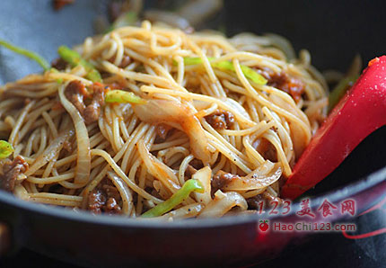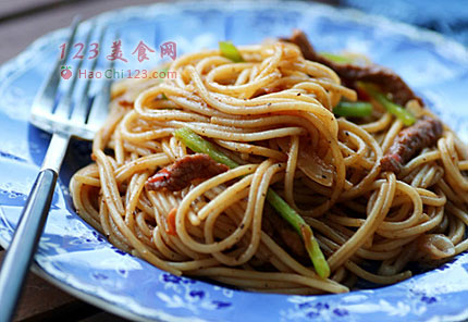 6、下入煮好的意面,加入盐、黑胡椒汁、少许老抽提色、加少量水,炒匀,下入牛肉丝,翻炒均匀即可出锅。
