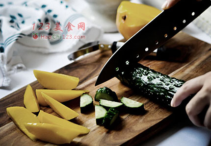 3、芒果去皮切块,黄瓜洗净同样切小块。