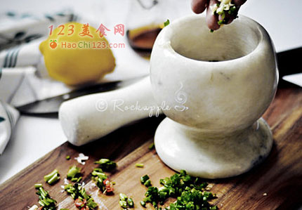 4、红辣椒去籽,香葱,大蒜,香菜根全部切碎,放入捣碎器内捣至混合出汁液,让香气充分释放。