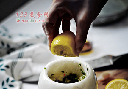 5、柠檬切半,将一半汁液挤入到香料中,加入糖,拌至融合。