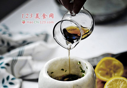 9、将所有配料混合入大碗内,加入薄荷叶,香菜叶,倒入冷藏过的调料。