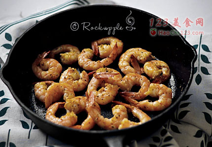 7、鲜虾去头去壳,抽去泥线,平底锅内加热倒入少量油,虾+盐+黑胡椒炒至变色。