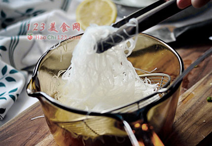 8、另取一锅加入水,煮沸后放入米粉烫熟至软捞出沥干水分备用。