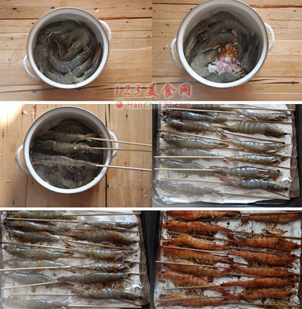 4、烤盘上垫锡纸,放上串好虾,刷一层油。
