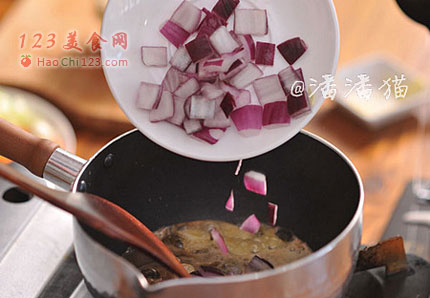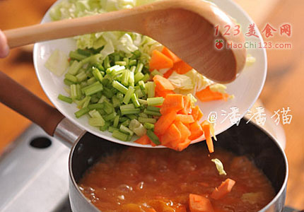 4、加入高汤。西红柿高汤煮沸后放入土豆、胡萝卜、芹菜、卷心菜同煮5分钟。