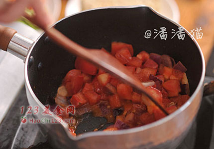 3、先放入西红柿翻炒,炒成西红柿酱。
