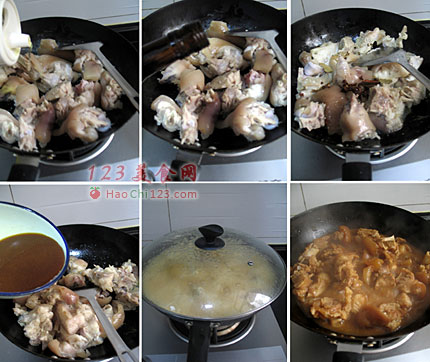 9、继续快手翻炒,炒至每块猪蹄都能均匀地裹上酒香后加入所有沥干水后的配料。