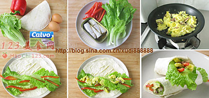 4、卷饼铺平,挤上适量沙拉酱,依次放上生菜、彩椒和丁香鱼炒鸡蛋。