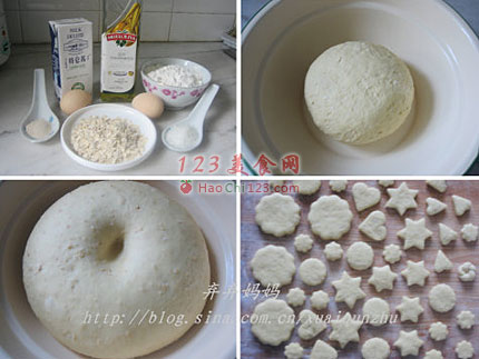 二、制作:面团发好了,取出来放在面板上,排气,揉透揉匀,用擀面杖擀成0.5cm左右厚的面皮,用模具压出各种形状,也可以用刀随意切成你喜欢的形状,做好的饼上扎几个小眼,避免烙成了球状。