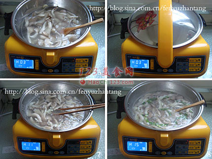 8、肉片煮熟,汤开后,放入盐,撒入葱花即可。