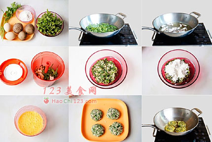 8、将食材团成团,压扁成小圆饼,均匀挂上全蛋面糊。