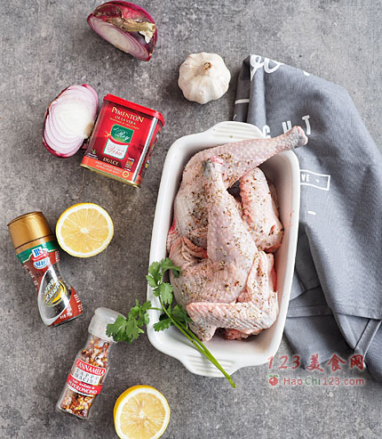 3、没有烟熏红椒粉怎么办?也可以换,你们可以抹上一些红辣椒粉,但是红辣椒粉是辣味,不是烟熏的风味,所以跟我做出来的味道会略有不同的。下面来看我之前做过的辣味香肠填馅烤鸡的照片,当时我们也是没有烟熏红椒粉,抹了一些红辣椒粉,但是不敢抹太多,所以颜色并不突出。这只鸡,我们揭开锡纸后烤了半小时,整个鸡皮相当脆卟卟哦。