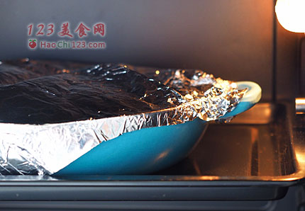 3、将烤碗表面盖上锡纸,放入190度烤箱,慢烤1小时。