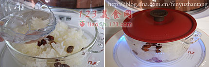 3、把雪耳、红枣和元肉放入微波炉煮锅里,加入1200ml清水。