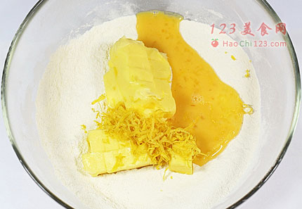 4、将柠檬皮、黄油、及全蛋液,倒入混合面粉中,用手抓揉混合成面团。