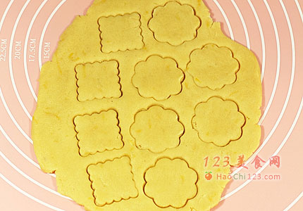 5、将面团擀成厚约1厘米的片状,用自己喜欢的模具压出所需要的饼干形状。
