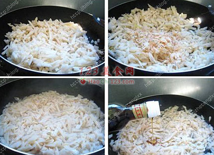 2、锅中座油,先煎香姜丝。