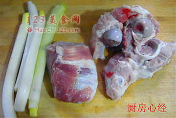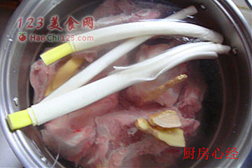 2、大棒骨洗净后,凉水入锅,加入大葱、姜片、料酒。煮制一小时捞出。