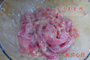 4、猪外脊切片上浆:盐、料酒、酱油、水少许、淀粉、生油抓匀。