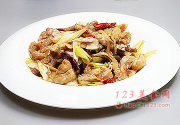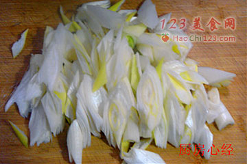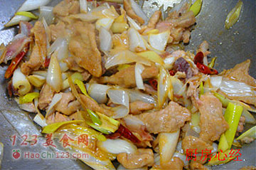 7、然后倒入大葱和棒骨肉,快速翻炒。调入酱油、料酒、盐炒匀出锅。
