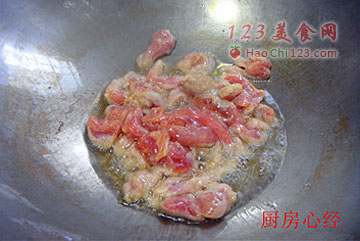 6、起锅放油,倒入猪外脊肉片炒熟。
