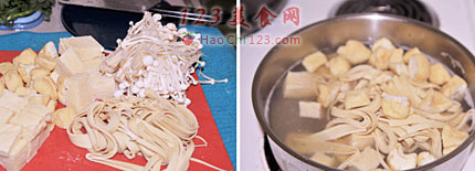 3、豆皮切成丝,豆泡一分为二,冻豆腐切成小块儿备用。