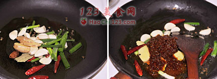 7、锅中放入适量油,然后放入调味料翻炒出香味。