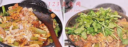 10、等食材都充分包裹住酱汁,放入切好的香菜段,关火即可。