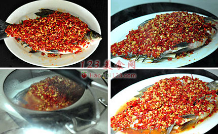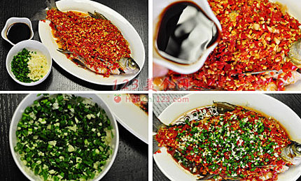 4、去除腌制时表面的葱姜,其余的可以塞在鱼腹内,表面铺满剁椒,鱼腹内也可铺一些,水开后将鱼上锅中火蒸制7—8分钟(鱼大则延时)。