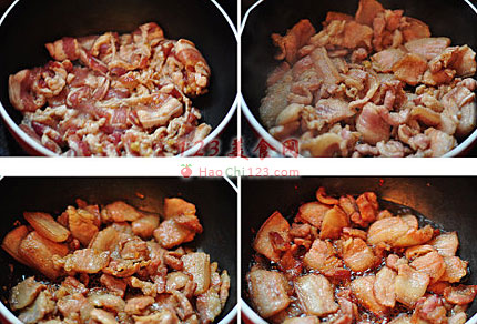2、锅里不放油,直接下肉片,小火加热到肉片变色,油脂慢慢析出。