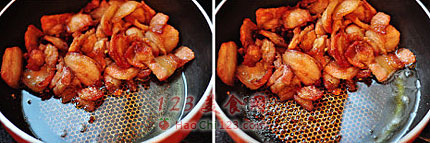 3、保持小火,油足够多时将肉片拨到一侧,倾斜锅身让油份集中。
