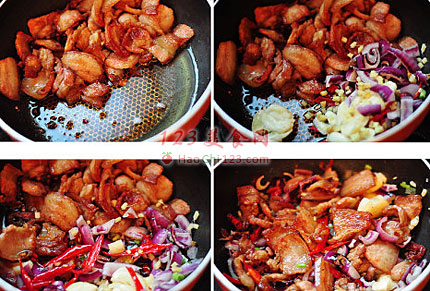 4、在一侧的油里下葱姜蒜辣椒和洋葱,单独炒出香味后再和肉片混合继续翻炒。