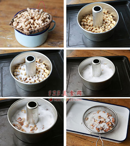 2、筛的时候麻烦些,有些细盐会在腰果上结块,但是细盐也有好处,会有少许沾在腰果上,微咸,味道更好。